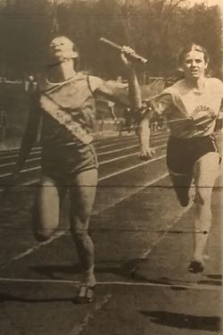 Einstein's sprinters were responsible for the victory as Carol Ward, Claudia Martin, Patty Polk and Ellen Kaiser won the 440 with a :51.7, and the shuttle lows with a :53.4, and finished a strong second in the 880.