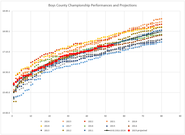 To assign the projected times to all the runners, you really only need to assign a projected time to one runner. Once one runner has an assigned projected time, the point scale dictates the finish times for every other runner within the ranking. It is not the first or last ranked runner that you want to key off of. It is the runners in the middle range that will be the most consistent year after year. The great thing about the county championship is that we have the same exact number of teams entered in the meet at the same time of the year, every year. The caliber of the middle tier varsity runners will not fluctuate very much from year to year.