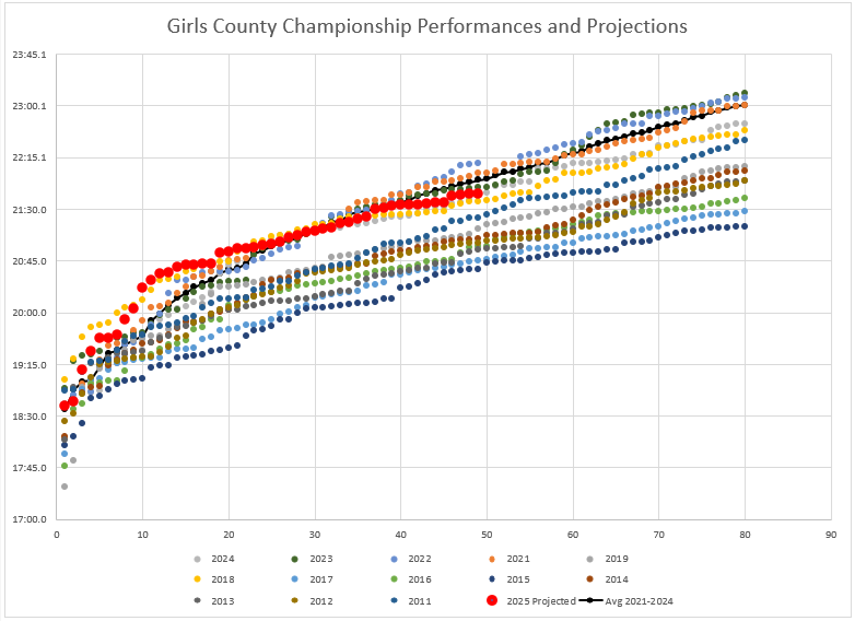 While the boys were a bit faster than the all-time course average last year, the girls were closer to the 2021-2024 average last year. Instead of calling 2025 an average year compared to the all-time course average, I have projected this year's girls to run in-line with the 2021-2024 average. I aimed to line up this years ranking with the 2021-2024 average trend line, paying particular attention to places 20 to 40.