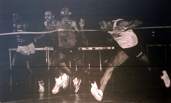 Photo Caption: Geoffrey S. Baker / Journal. Woodlawn's Richard Smith (center) edges Gaithersburg's Gene Cann by a nose (or mouth) in the 55-meter dash at the state indoor track championships.